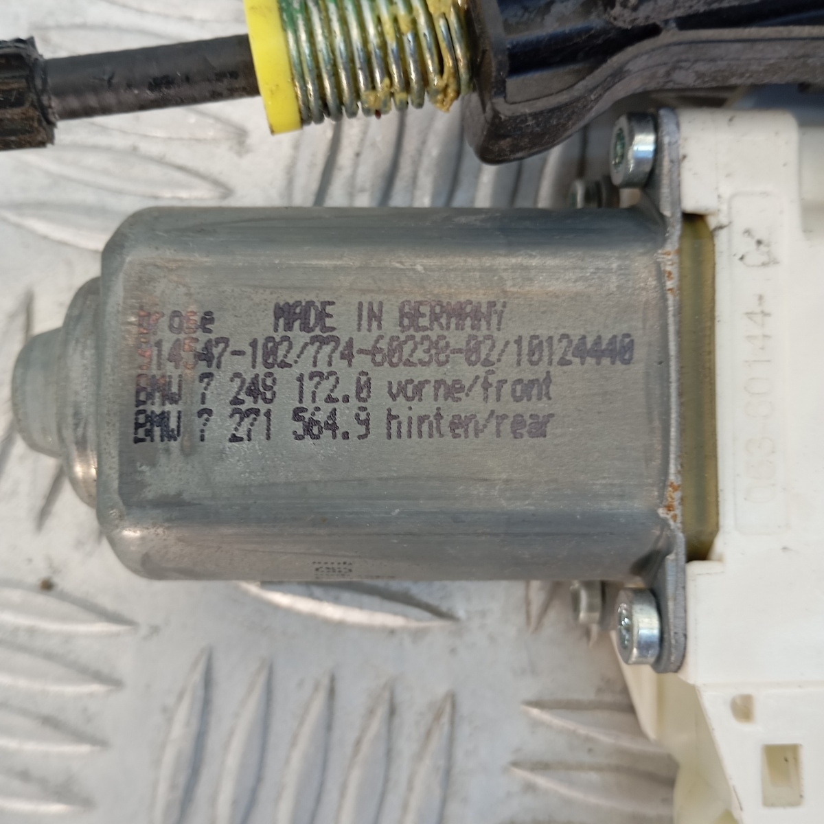 Alzacristallo anteriore destro BMW Serie 5 F10 con motore OEM 7249172.0. Il componente è completo di guida metallica, sistema a cavo e motorino elettr…
