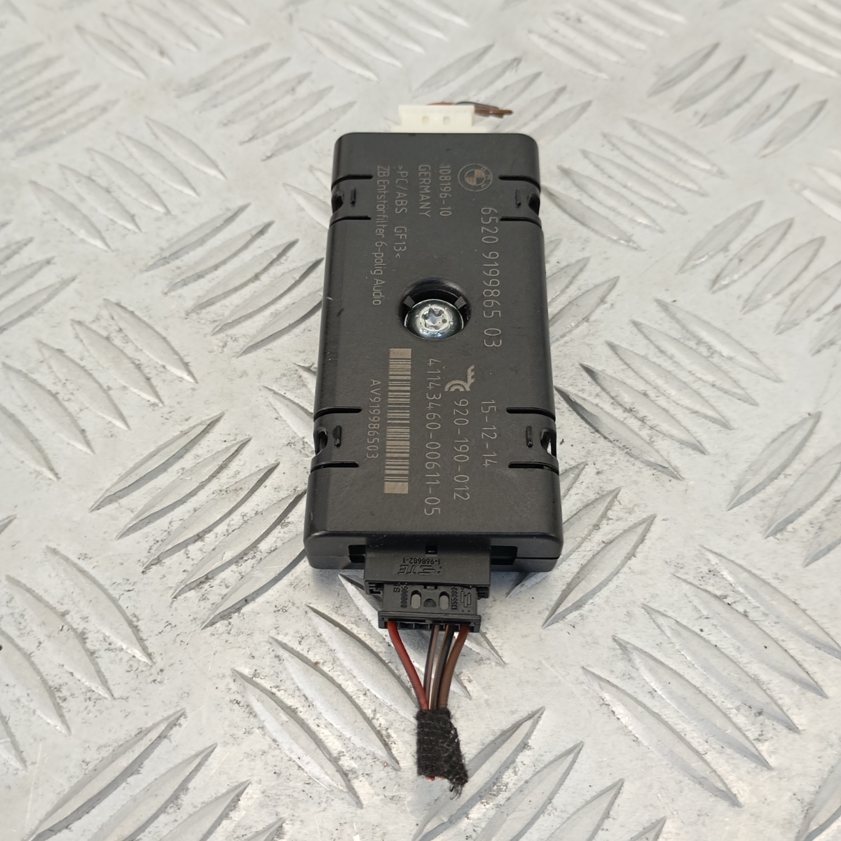 Amplificatore antenna BMW / filtro segnale radio per BMW Serie 5 F10 F11, progettato per eliminare disturbi nell’impianto audio e migliorare la ricezione del segnale radio.Conosciuto anche come modulo filtro antenna, centralina segnale radio, o modulo eliminazione interferenze, questo ricambio è dotato di connettore a 6 pin e struttura compatta in plastica antiurto.Prodotto in Germania, materiale tecnico PC/ABS GF13, compatibile OEM con impianti radio di fabbrica.Facile da installare, plug & play, si collega direttamente all’antenna o vetro posteriore. Testato e funzionante.