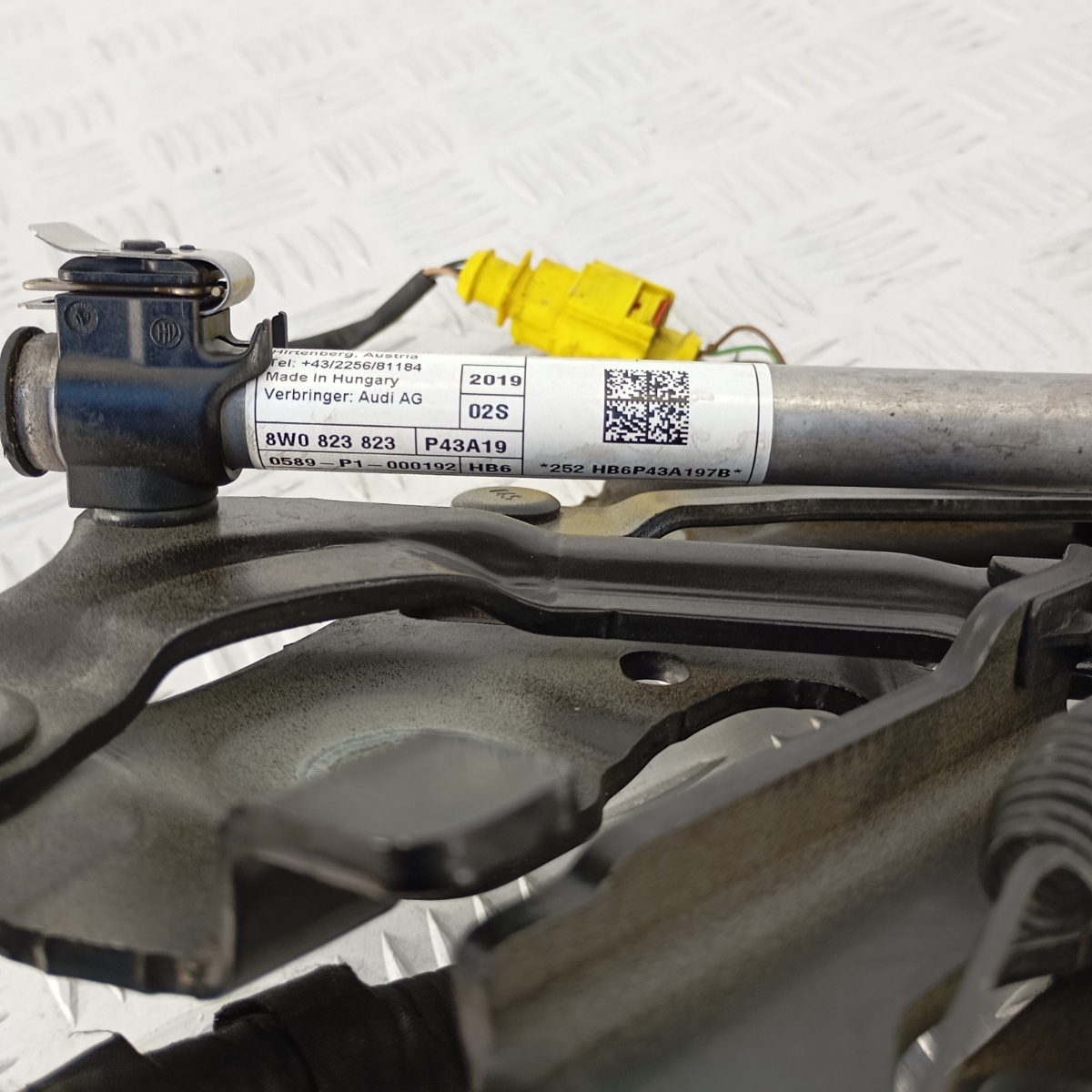 Cerniera cofano attivo originale Audi A4 B9 lato destro (lato passeggero), smontata da veicolo immatricolato nel 2020.