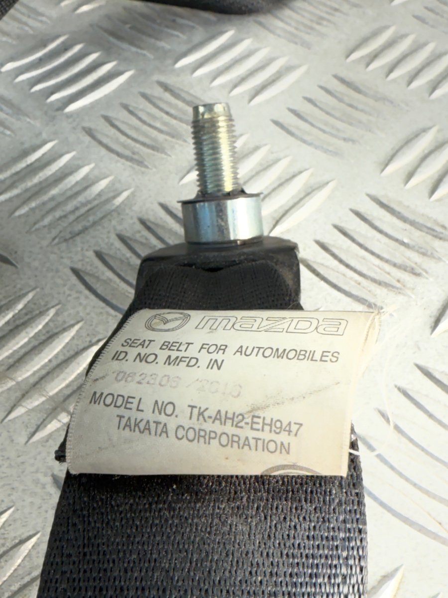Cintura di sicurezza per sedile guida (anteriore sinistro) proveniente da Mazda 6 terza serie (GJ/GL), carrozzeria berlina. Il componente include il pretensionatore pirotecnico con cablaggio e connettore giallo airbag. La cintura è completamente funzionante, il riavvolgimento è regolare e senza impuntamenti. Tessuto integro, con minimi segni di normale utilizzo.