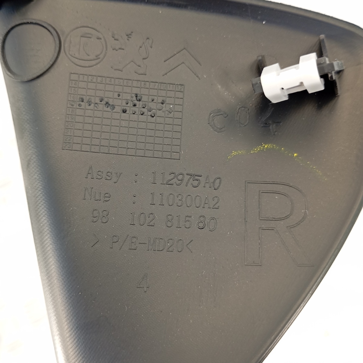 Cover plastica tunnel centrale destra originale PSA, smontato da veicoli Peugeot e Citroën di ultima generazione.Ricambio posizionato sulla parte inferiore destra del tunnel centrale, lato passeggero, con clip di fissaggio originali e inserto fonoassorbente interno.Codice principale di riferimento OEM 9810281580, con codici secondari stampati Assy: 112975A0 e Nue: 110300A2.✔ Ricambio originale OEM Peugeot / Citroën✔ Copertura laterale tunnel centrale destra✔ Montaggio diretto con attacchi originali, nessuna modifica necessariaIl pannello laterale destro consolle è un componente estetico e funzionale, ideale per ripristinare l’integrità dell’abitacolo in caso di rottura o smontaggio.Compatibilità perfetta su diversi modelli SUV del gruppo PSA dotati di plancia i-Cockpit.