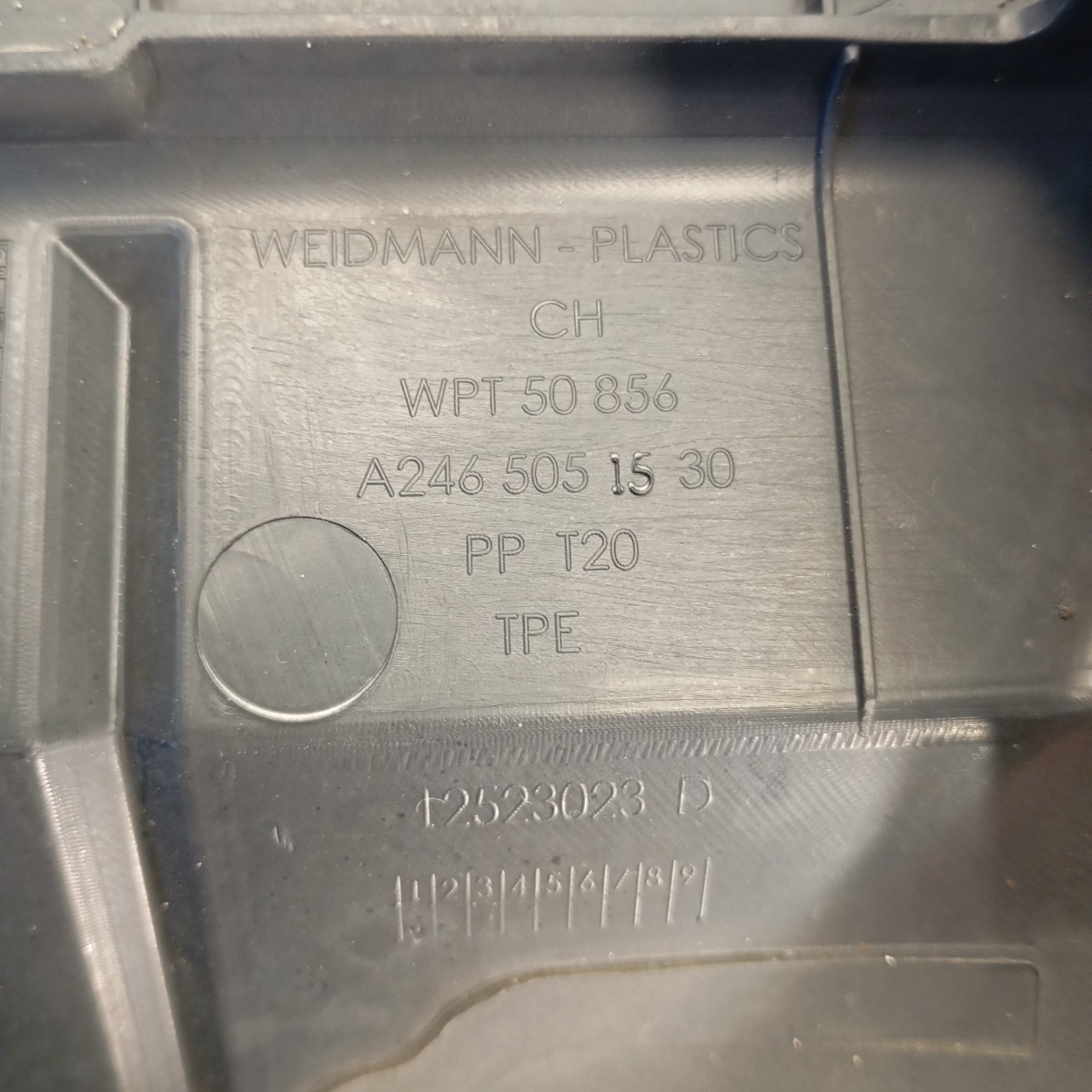 Deflettore aria motore inferiore originale Mercedes-Benz, posizionato sotto il paraurti anteriore o nella zona motore inferiore. Codice OEM A246 505 15 30, in materiale plastico rinforzato PP-T20, prodotto da Weidmann-Plastics.Questo condotto aria, noto anche come air duct anteriore, carter inferiore motore, canalina deflusso aria sottoscocca o spoiler inferiore aerodinamico, è progettato per convogliare il flusso d’aria verso radiatore, intercooler e vano motore, contribuendo al corretto raffreddamento e all’efficienza aerodinamica del veicolo.