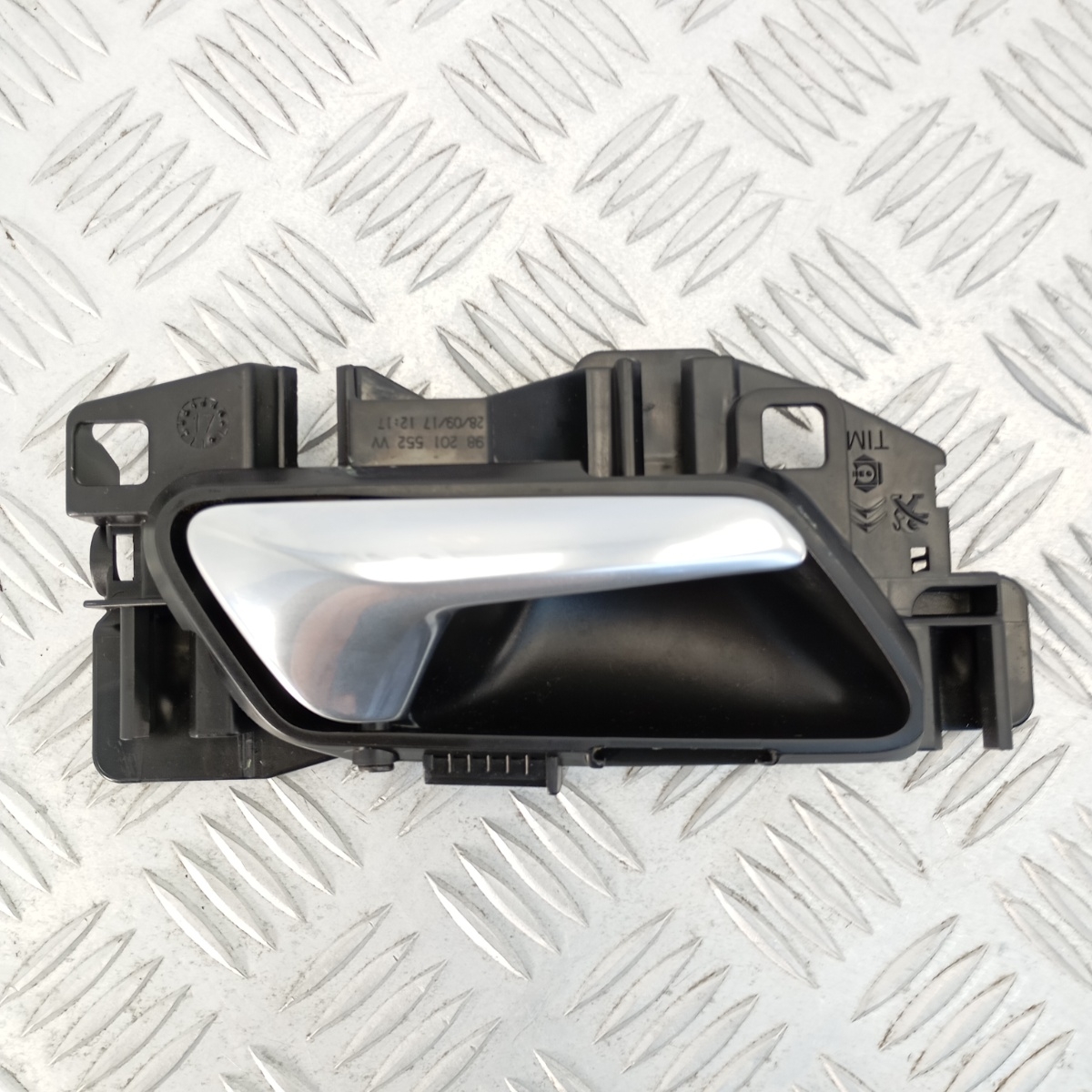 Maniglia interna anteriore destra originale Peugeot, smontata da 3008 seconda serie. Il ricambio, codice OEM 98201552VV, è dotato di impugnatura cromata effetto alluminio e struttura in plastica tecnica ABS. Si tratta di un componente interno di apertura porta, perfettamente compatibile con l`impianto originale del veicolo.Questa leva apertura porta, chiamata anche maniglia cromata interna o impugnatura portiera, garantisce un montaggio rapido e preciso nella portiera anteriore destra. Il design moderno si integra perfettamente con gli interni della Peugeot 3008, offrendo resistenza e durata nel tempo.È una soluzione ideale per sostituire una maniglia danneggiata, mantenendo intatto l’aspetto originale della vettura.