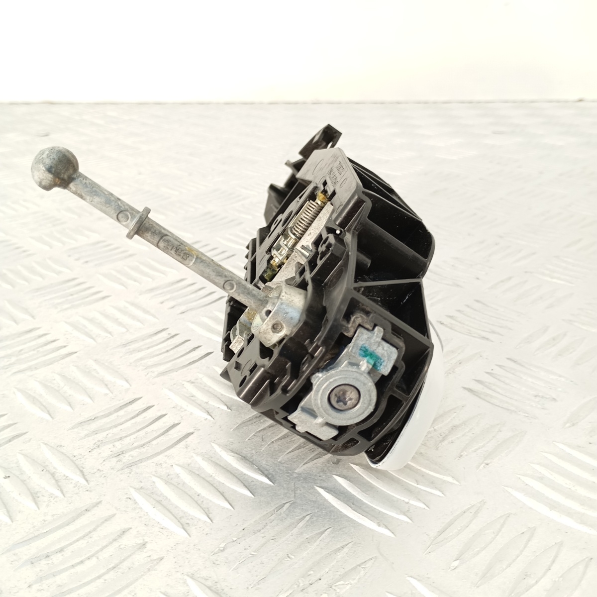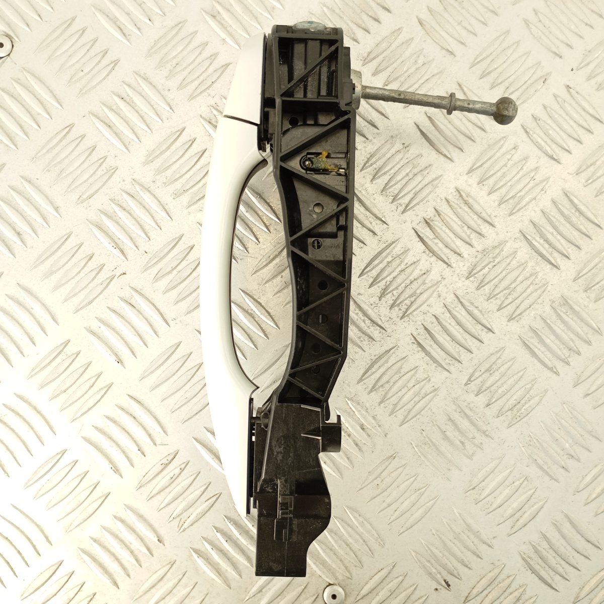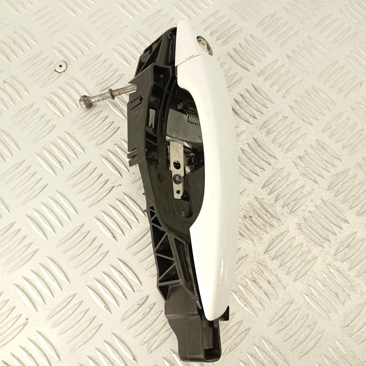 Maniglia  porta anteriore sinistra Citroën C3 Aircross e C3 III 2016–2022, colore bianco originale verniciato, completa di struttura interna, leva meccanica e tirante metallico. Ricambio smontato da veicolo Citroën C3 Aircross anno 2019, compatibile anche con C3 III di terza generazione. Struttura in plastica tecnica con superficie esterna liscia verniciata, funzionamento fluido, nessuna crepa o danno alla sede di montaggio. Ricambio noto come maniglia porta lato guida, conosciuto come impugnatura porta anteriore sinistra, maniglia esterna sinistra C3 Aircross, leva apertura porta sinistra o maniglia carrozzeria anteriore lato guida.