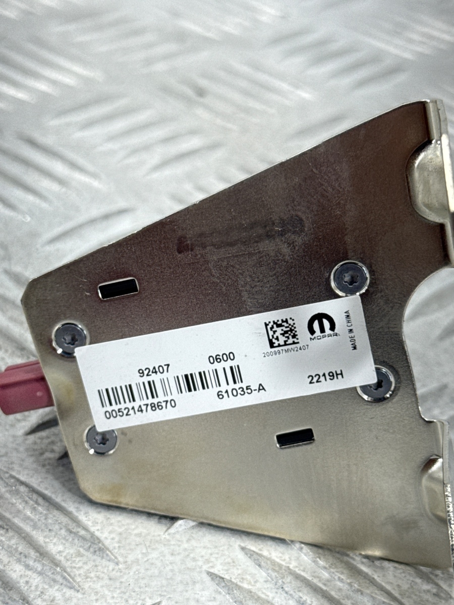 Modulo antenna GPS Mopar Jeep Renegade Fiat 500X, unità ricezione segnale satellitare per sistemi di navigazione integrati. Antenna GPS con corpo in plastica nera e staffa di fissaggio in metallo zincato, progettata per collegamento diretto all’unità infotainment tramite connettore coassiale tipo Fakra rosa. Struttura compatta preassemblata, pronta al montaggio su supporto originale.