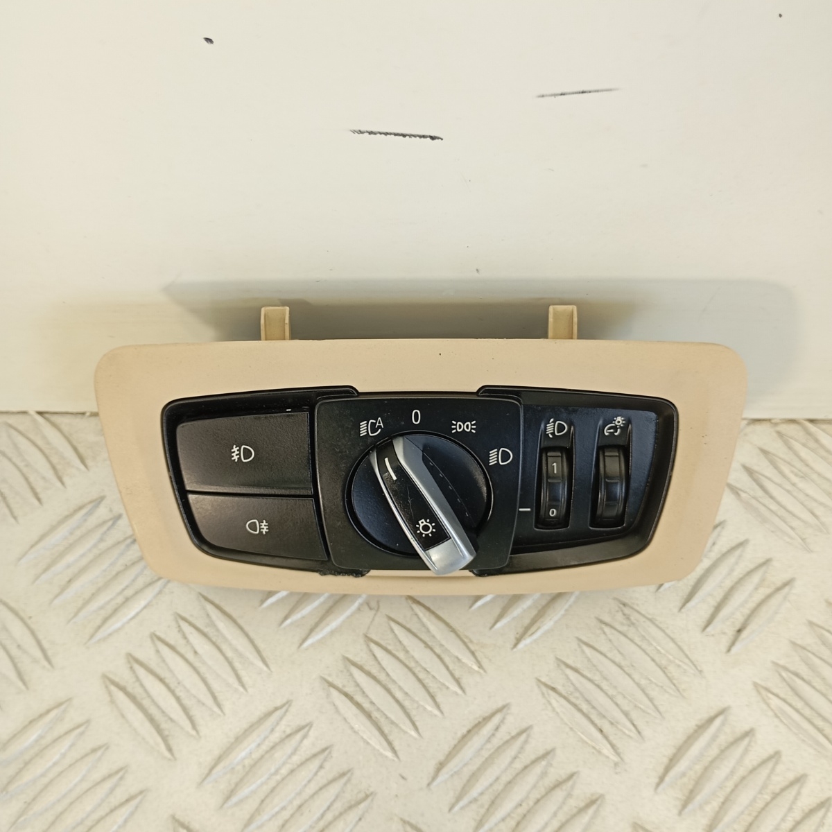 Modulo Comando Luci Fari originale BMW, installato sul lato sinistro del cruscotto (lato guida). Questo modulo è responsabile della gestione completa dei gruppi ottici anteriori del veicolo, offrendo accesso diretto ai comandi delle luci diurne, anabbaglianti, abbaglianti, fendinebbia, posizione automatica (Auto), regolazione altezza fari e luminosità quadro strumenti.L’estetica del componente è caratterizzata da plancia in plastica beige con cornice integrata, ideale per veicoli con interni chiari. La sezione comandi è in nero lucido, con manopola cromata e simboli serigrafati di colore bianco perfettamente leggibili. Il contrasto tra beige e nero/cromo conferisce al modulo un aspetto elegante e perfettamente in linea con il design premium BMW.Ricambio noto ccome comando luci, interruttore fari, modulo luci cruscotto, centralina luci anteriori, pannello controllo luci, gruppo luci sinistro, selettore luci, regolatore fari internazionalmente identificato come headlight switch, light control module, headlamp adjuster, BMW light panel unit.