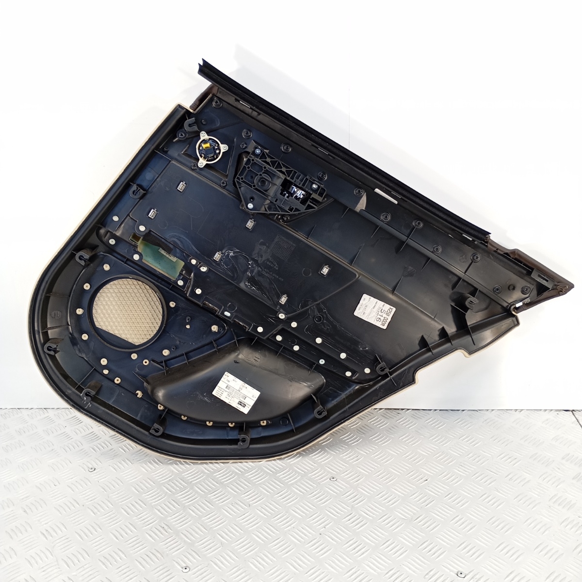 Rivestimento Porta Posteriore SX Jaguar XF 2011 Beige Legno OEM 8X23-F274A31-A, anno 2011. Colore beige chiaro con parte superiore in pelle marrone scuro e inserto decorativo in legno lucido, finitura premium Jaguar.Conosciuto anche come pannello interno porta, rivestimento porta, o door trim panel, è completo di maniglia cromata, griglia altoparlante integrata e struttura rigida in plastica PP+MD17. Codice stampato: 8X23-F274A31-A.