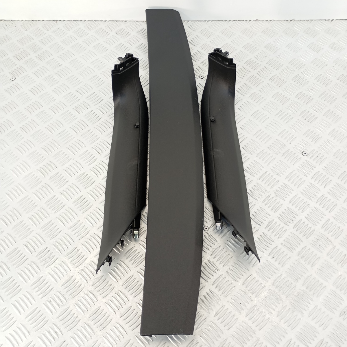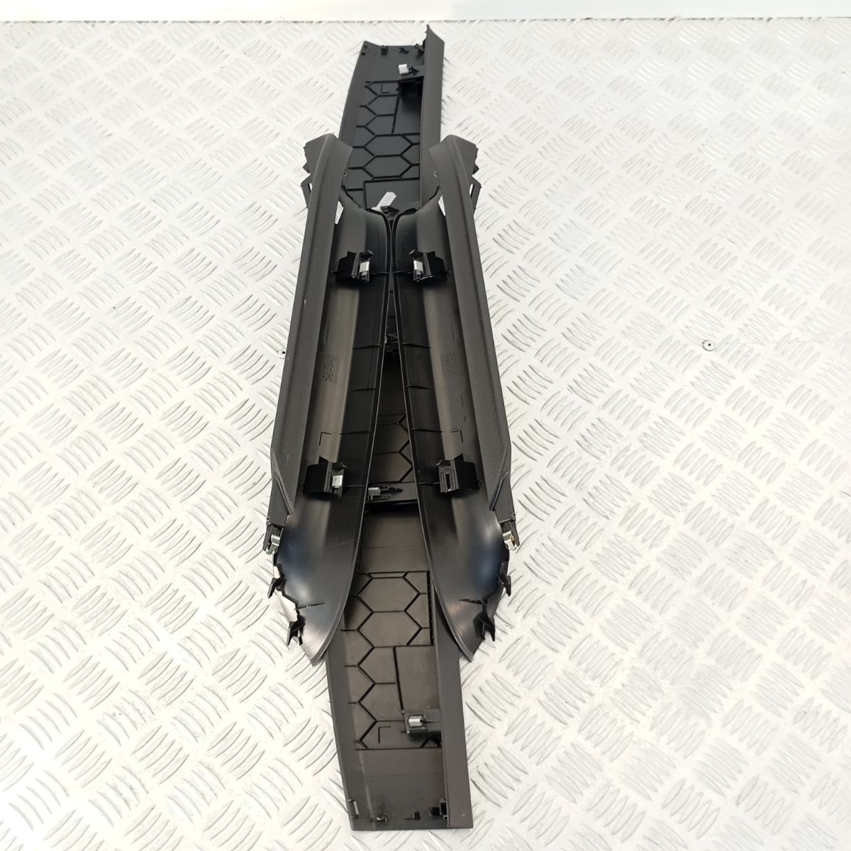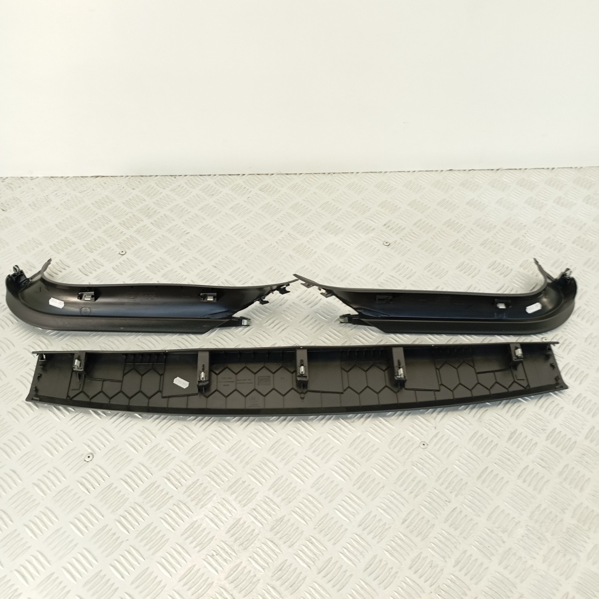 Set completo di modanature posteriori originali Volkswagen T-Roc, composto da 3 elementi: profilo centrale e due modanature laterali, montati sul lato interno inferiore del portellone o lungo la base del paraurti posteriore, a seconda della configurazione. Codici OEM stampati: 2GA867707 (centrale), 2GA867703 (lato destro), 2GA867704 (lato sinistro).I componenti sono realizzati in plastica tecnica >PP/PE-TD16